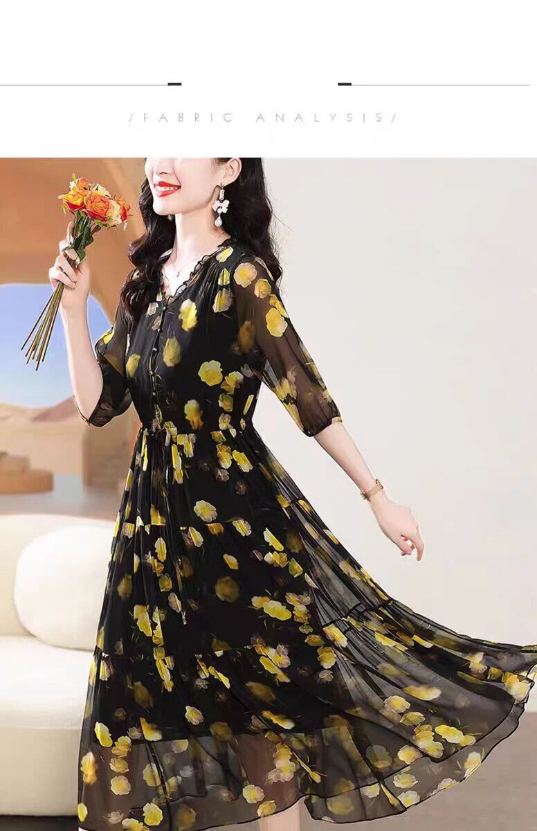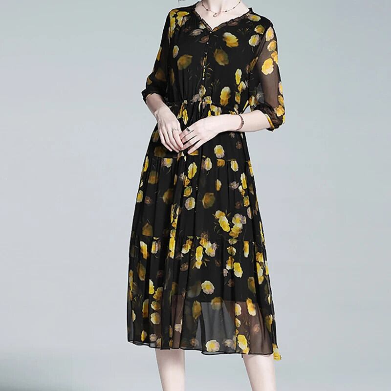 送料無料 アパレル Evnisi Frauen Chic Blumen druck Chiffon Kleid V-Ausschnitt Natur seideelegante Büro Rüschen Kleider Frauen Sommer Fee Vestido シフォン エレガント AE12125556664217266898 | mihatudai(みはつばい)ネットショッピングならmihatudai