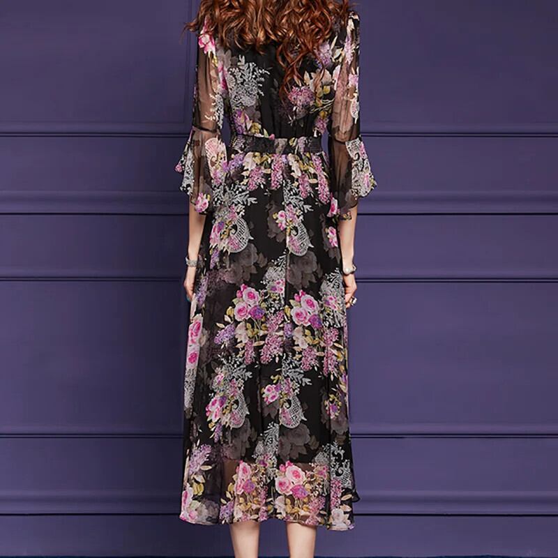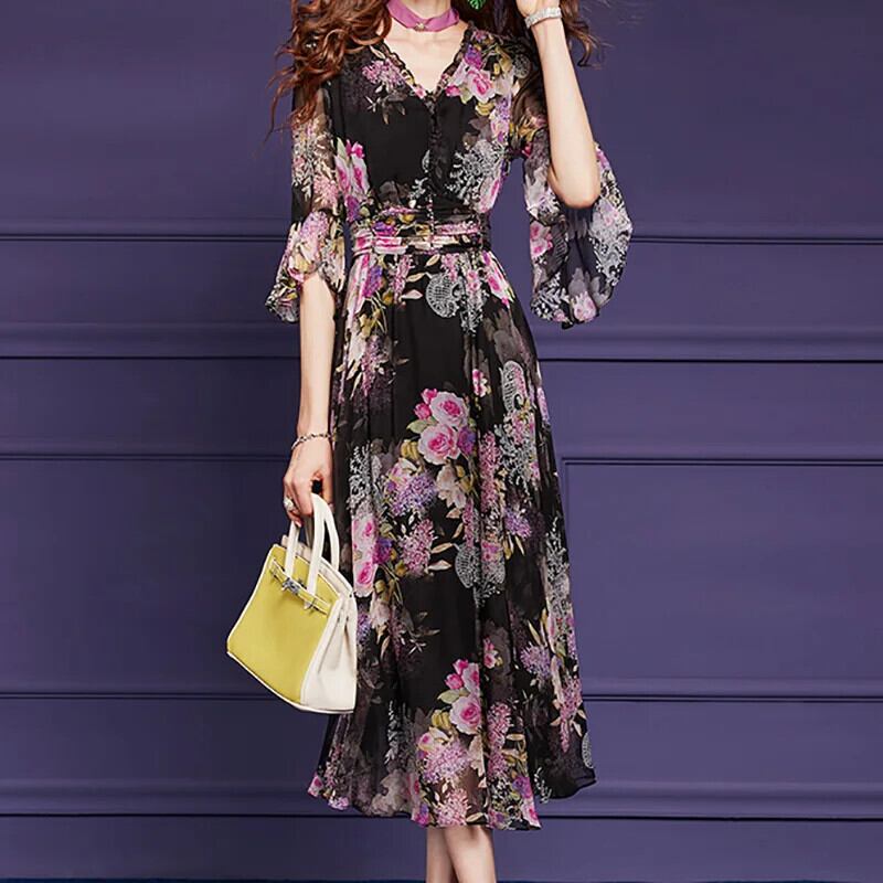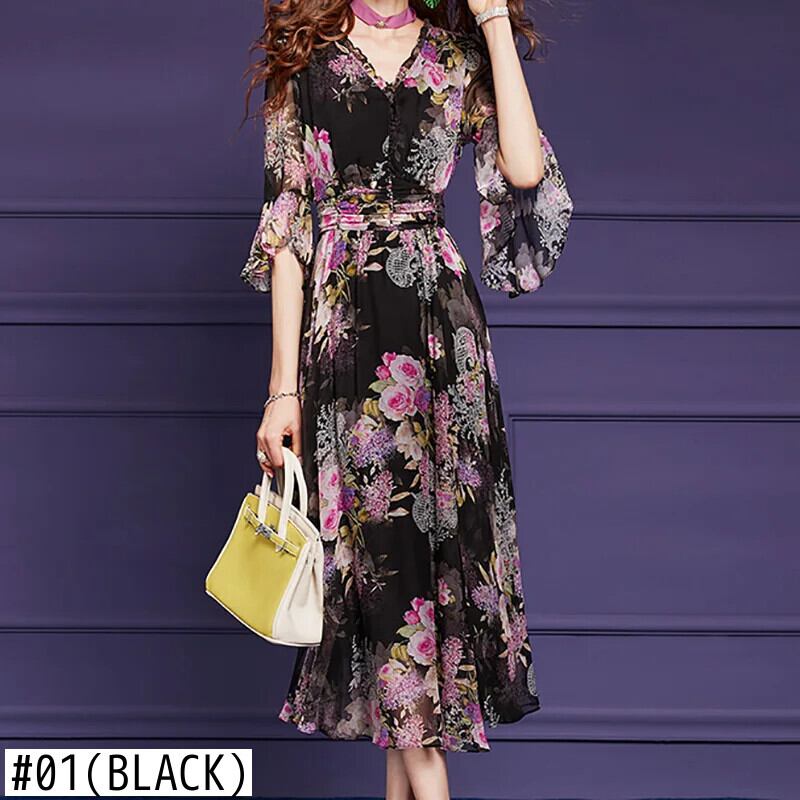 送料無料 アパレル Evnisi Frauen Chic Rüschen Chiffon Kleidelegante Blumen druck natürliche Seide Kleider V-Ausschnitt Büro Frauen Sommer Fee Vestido シフォン エレガント AE12125556619871320601 | mihatudai(みはつばい)ネットショッピングならmihatudai