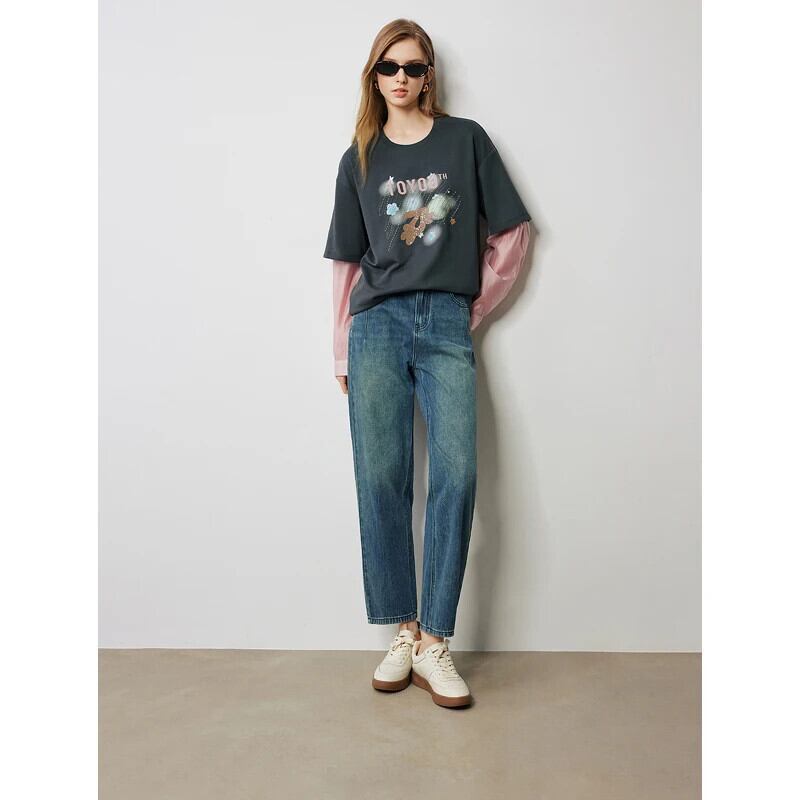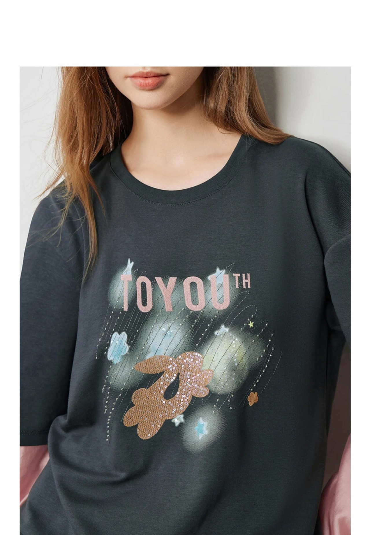 送料無料 アパレル Toyouth Frauen T シャツ Herbst neue gefälschte zweiteilige パッチワーク Perlen bestickt loss Rundhals-Top grau Tシャツ AE332328878770709333326 | mihatudai(みはつばい)ネットショッピングならmihatudai