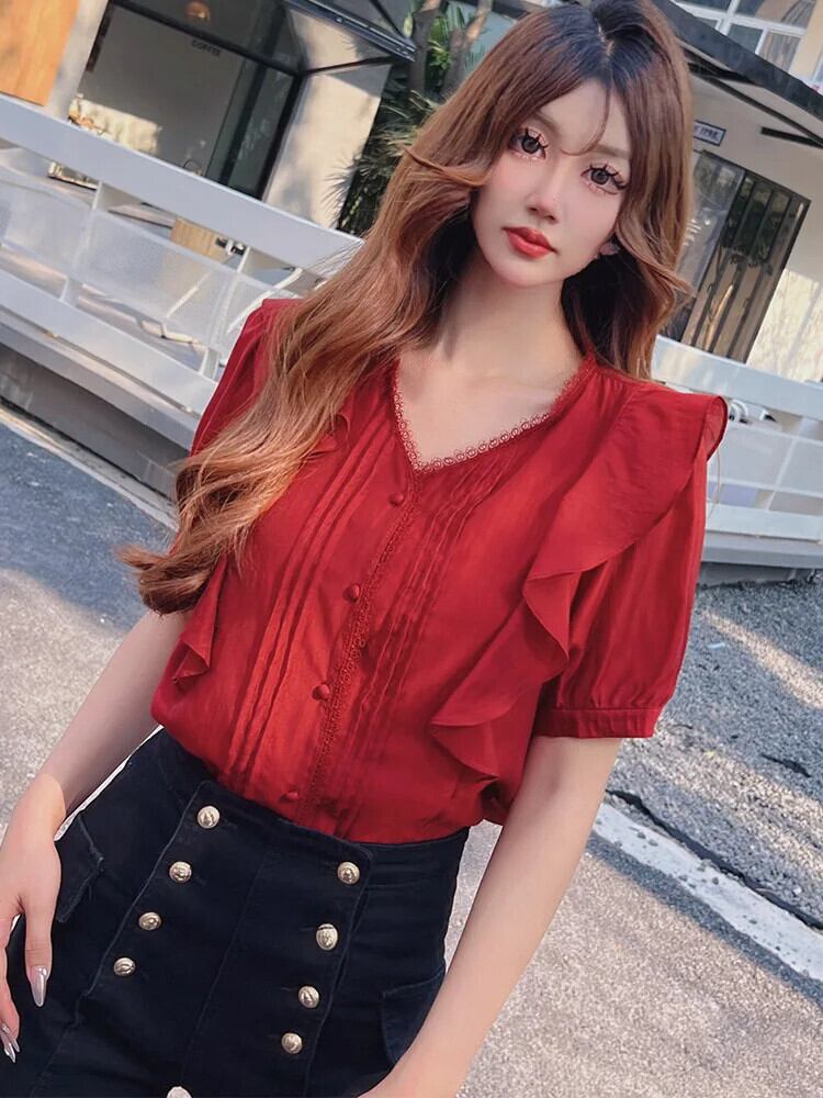 送料無料 アパレル Dabuwawa Rüschen Blusen Frauen Sommer neue Kurzarmhemd lässig Büro Dame Top dm1bst058 AE121255556868607574