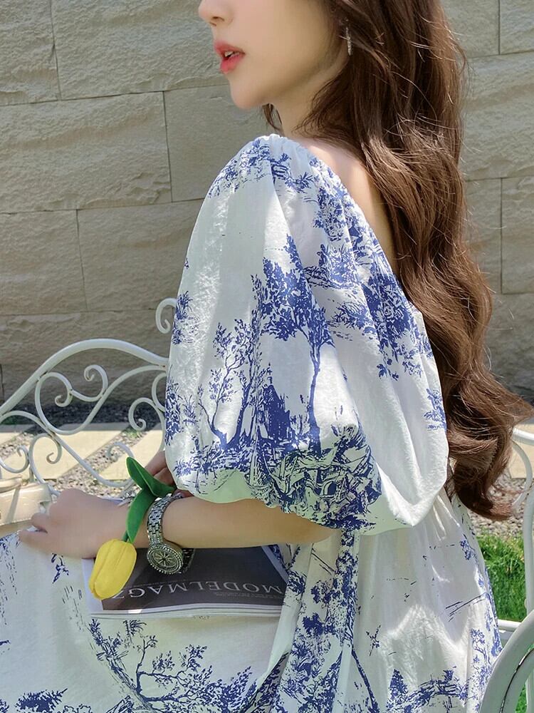 送料無料 アパレル Dabuwawa-のためのティエンダプリントドレス、ランタンスリーブ、シャーリングスカート、エレガントなドレス、y2k、da1bdr023 AE121255573810722645 | mihatudai(みはつばい)ネットショッピングならmihatudai