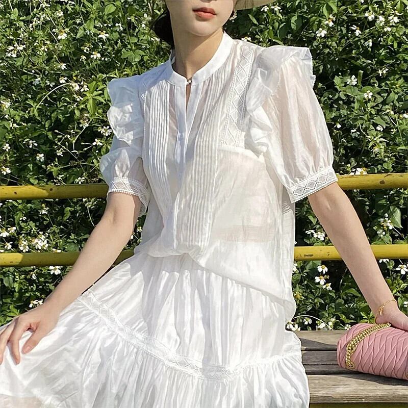 送料無料 アパレル Gekräuselte Spitze Bluse weiß Urlaub bestickt Kurzarm lässig トップス シャツ Vintage Sommer neu in Frauen kleidung ビンテージ AE121288715038105244 | mihatudai(みはつばい)ネットショッピングならmihatudai